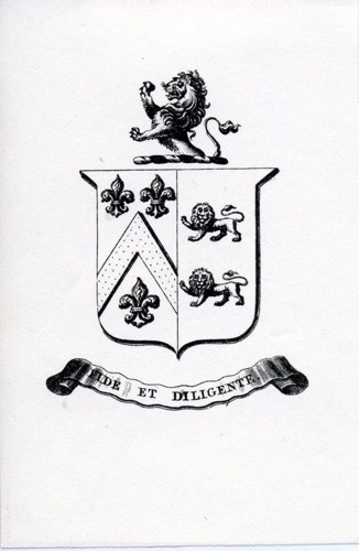 Henry Jones' bookplate showing his arms on the left and those of his wife Magdalene Jones on the right