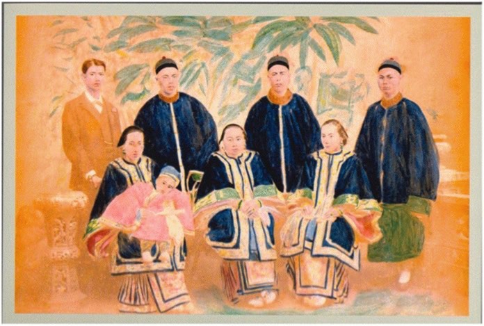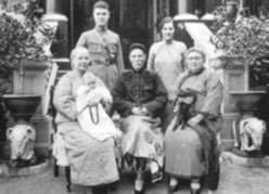 Sir Rebert Ho Tung and his two wives Lady Clara Cheaung Lin-Kok (left) Madam Margaret Mak Sau Ying (on the right) His son Ho Shai-Lai and daughter in law Hesta Ki-Fan are standing behind.